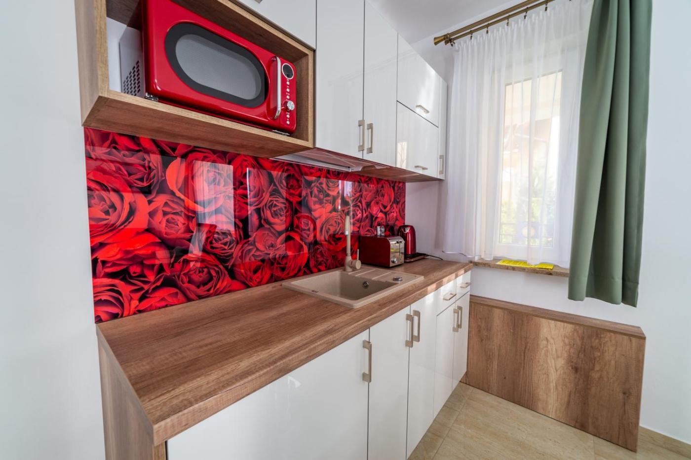 Apartament. This apartment is comprised of 1 living room, 1 separate bedroom and 1 bathroom with a shower and a hairdryer. Meals can be prepared in the well-fitted kitchenette, which is fitted with a refrigerator, kitchenware and a microwave. The apartment offers a wardrobe, an electric kettle, a barbecue, a flat-screen TV, as well as garden views. The unit offers 2 beds. Apartament - 4 osobowy. Powierzchnia pokoju ok.: 43 mkw. ;