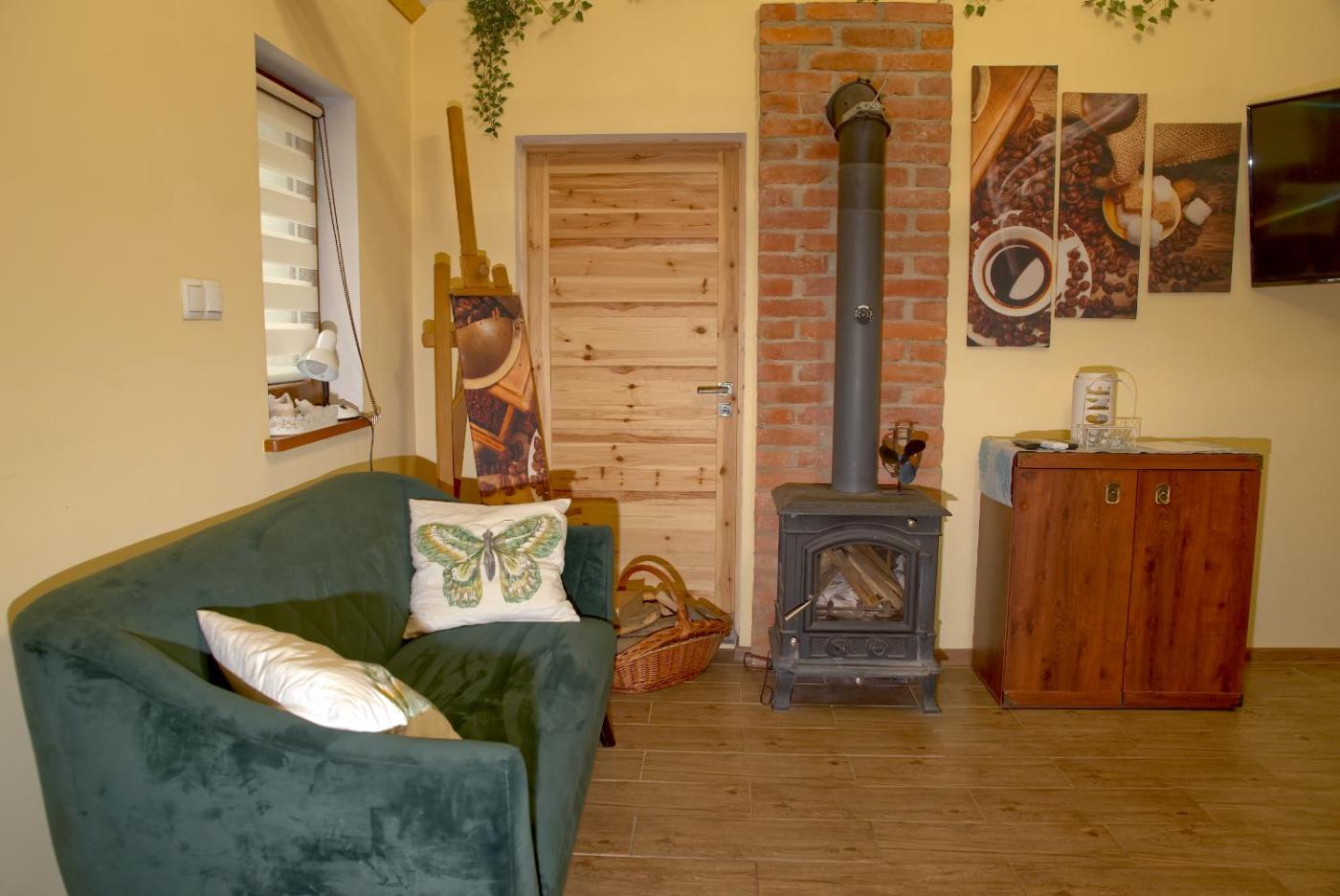 Domek. This chalet offers a fireplace. Featuring a private entrance, this air-conditioned chalet comprises 1 living room, 1 separate bedroom and 1 bathroom with a shower and a hairdryer. Guests will find a stovetop, a refrigerator, a dishwasher and kitchenware in the well-fitted kitchenette. The chalet also provides guests with a barbecue. Boasting a terrace with garden views, this chalet also provides a washing machine and a flat-screen TV with streaming services. The unit offers 4 beds. Domek - 5 osobowy. Powierzchnia pokoju ok.: 50 mkw.