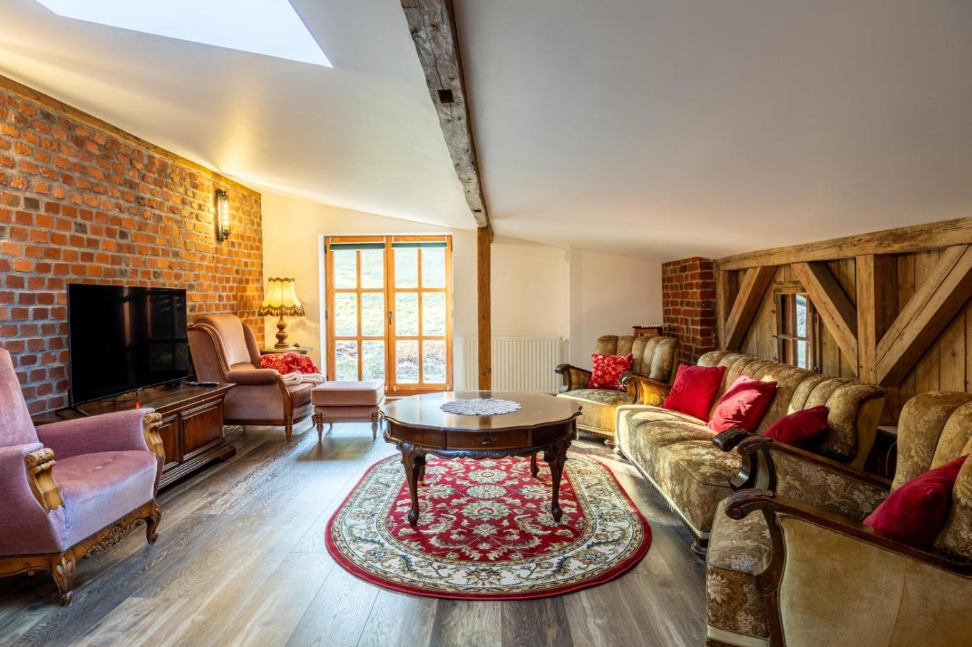 Willa. This villa offers a fireplace. Meals can be prepared in the well-fitted kitchen, which comes with a refrigerator, a dishwasher, kitchenware and an oven. The spacious villa provides a washing machine, a tea and coffee maker, a terrace with garden views as well as a shared bathroom featuring a bath or a shower. The unit offers 9 beds. Willa - 12 osobowy. Powierzchnia pokoju ok.: 240 mkw.