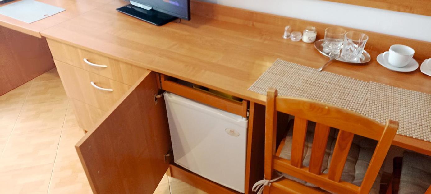 Wyposażenie obejmuje także lodówkę, mikrofalówkę i czajnik.