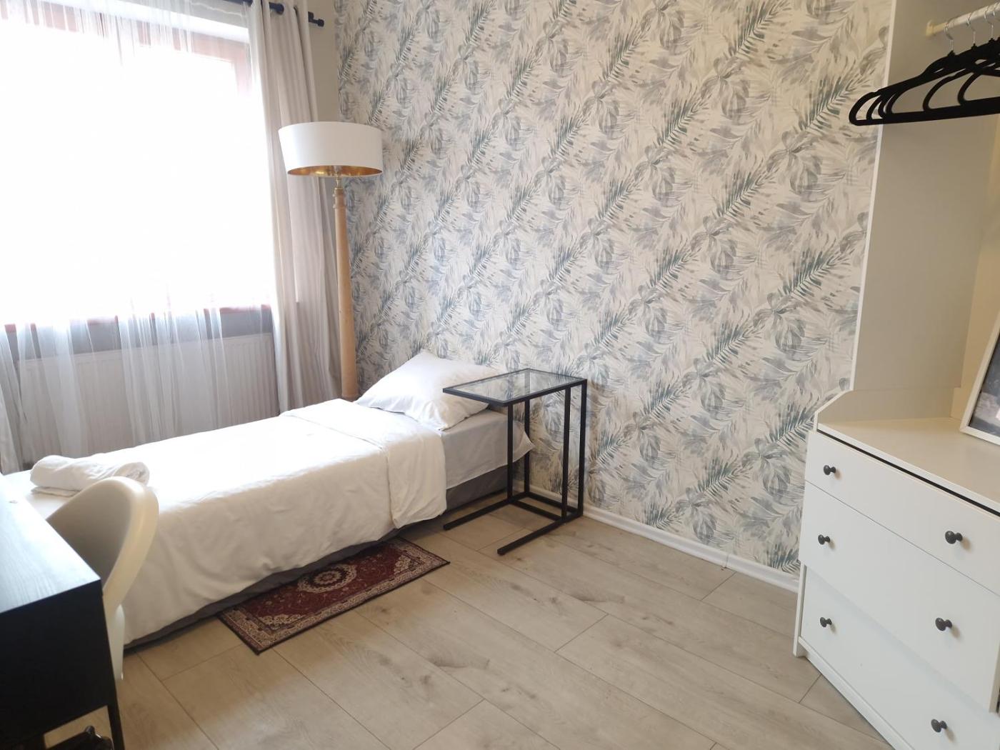 Duży pokój dwuosobowy. The double room provides a wardrobe and parquet floors, as well as a shared bathroom featuring a shower. The double room features heating and city views. The unit offers 2 beds. Pokój Dwuosobowy - 2 osobowy. Powierzchnia pokoju ok.: 12 mkw. ;